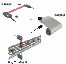 ・進行通過位置偏差的落料檢測、蜿蜒檢測,或是不受孔影響的物體檢測時,最適合利用區域光束。
