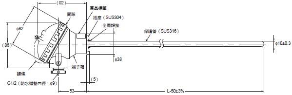 * L為cm單位,50為mm單位。因此,以E52-P75C-N型為例,由於L=75 (cm),故保護管部的長度 為L-50=750-50=700 (mm)。