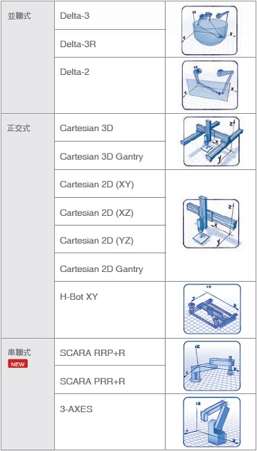 • 以單一控制器可控制並聯式、正交式、串聯式機械手臂最多共 8 台※