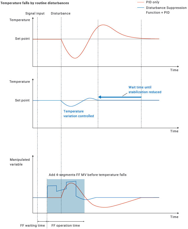 The Disturbance Suppression Function is a control function that automatically suppresses temperature variations that are expected to be caused by foreseeable disturbances. Trigger signals input to the temperature controller before these disturbances occur turn the function on, which adds to or subtracts from the manipulated variable (MV). Disturbance autotuning automatically adjusts the FF (feedforward) MV, FF operation time, and FF waiting time.