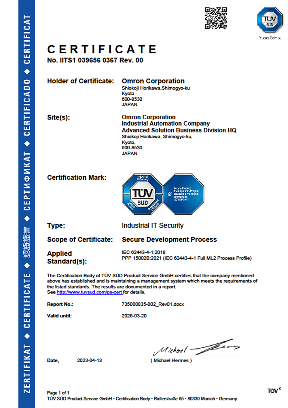 OMRON集團旗下的工業自動化事業體中,商品事業部、控制器事業部和先進解決方案事業部*1,已取得國際標準 IEC 62443-4-1 的第三方認證。